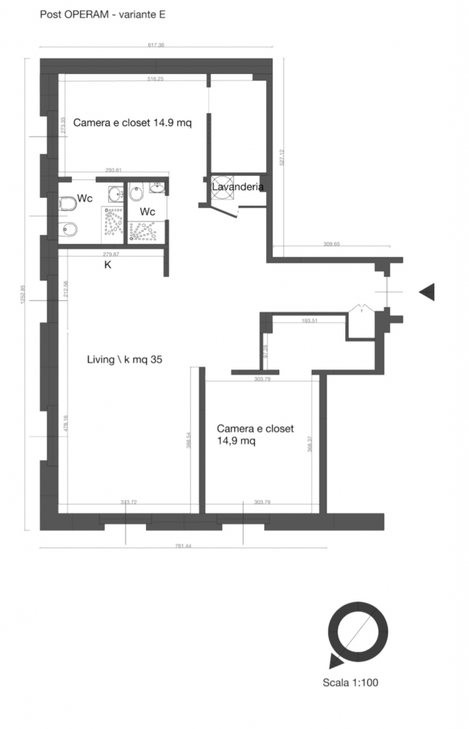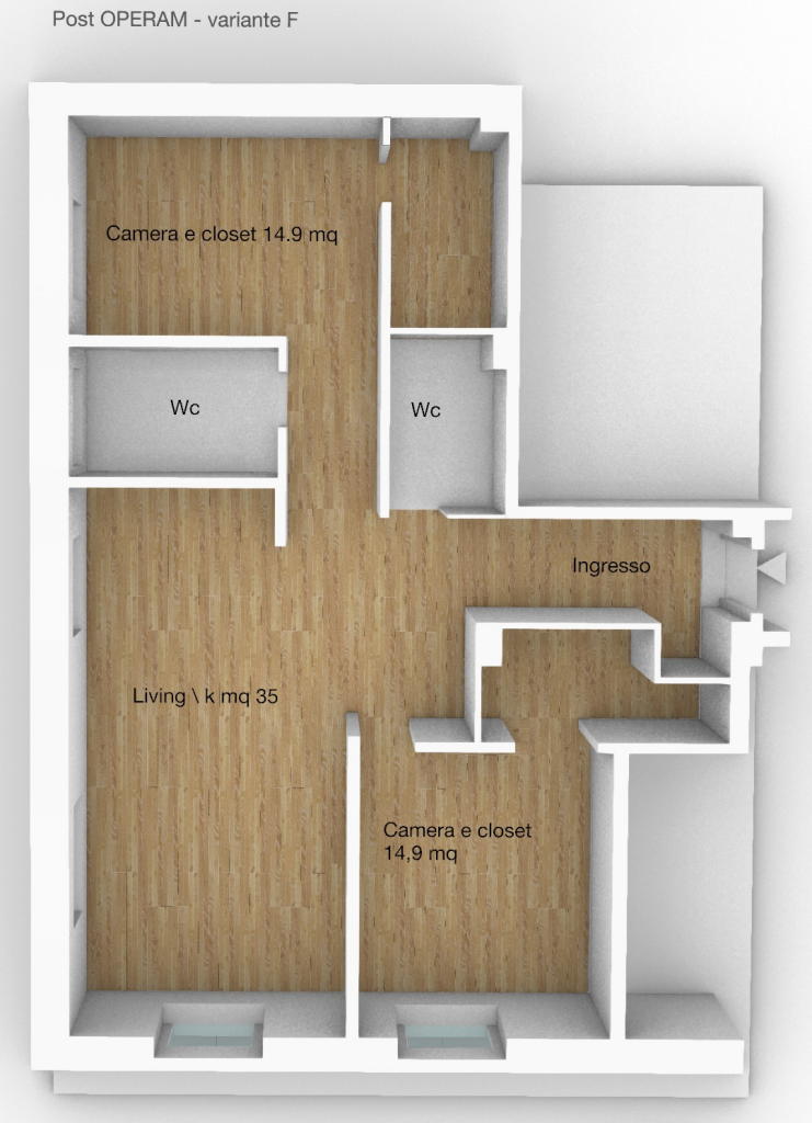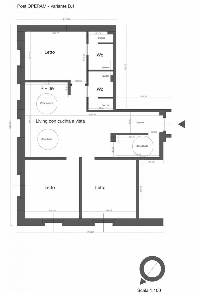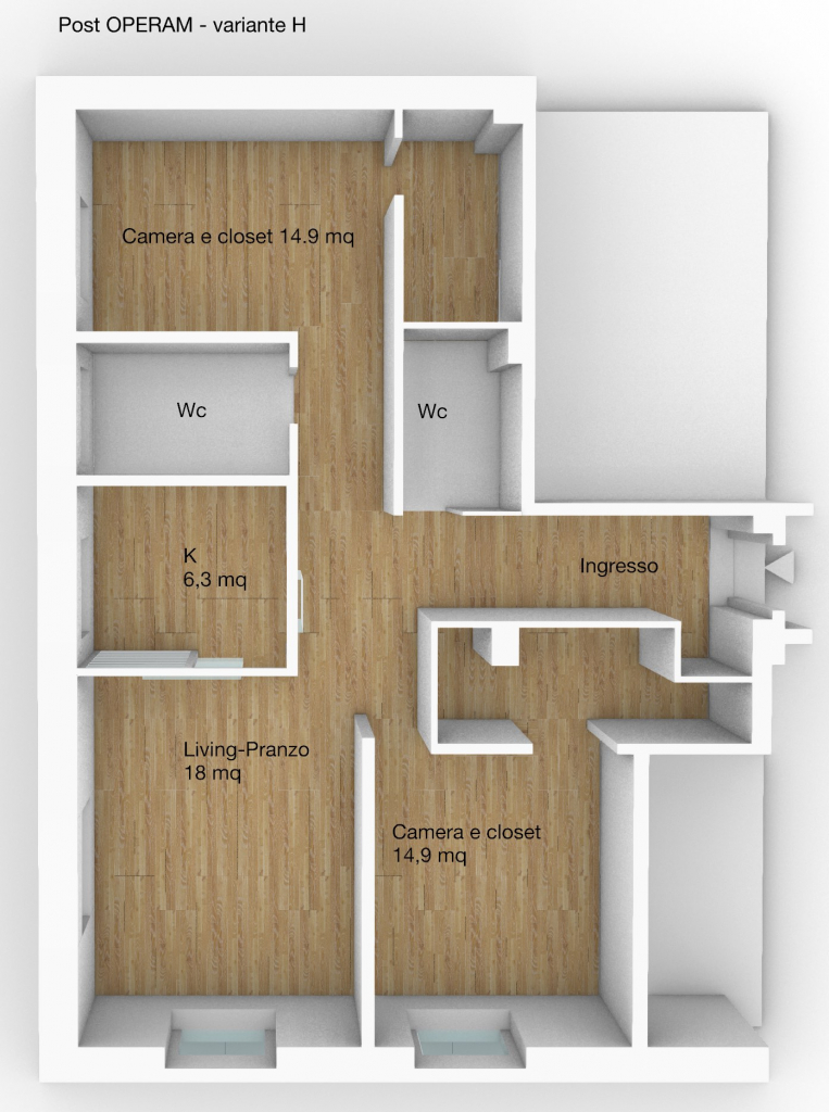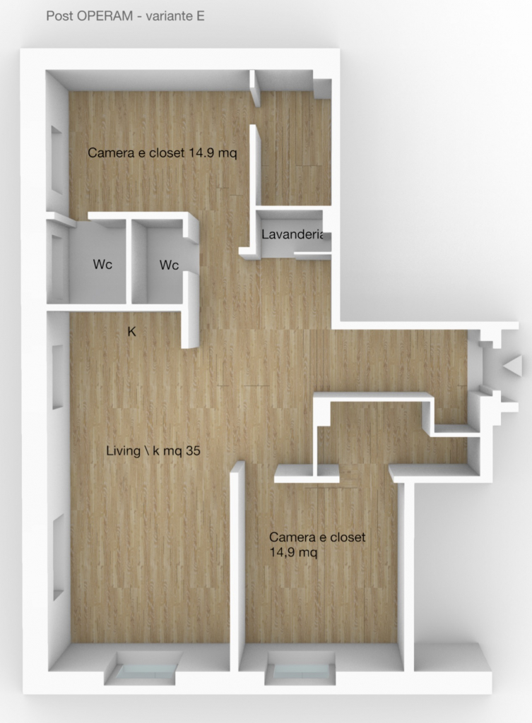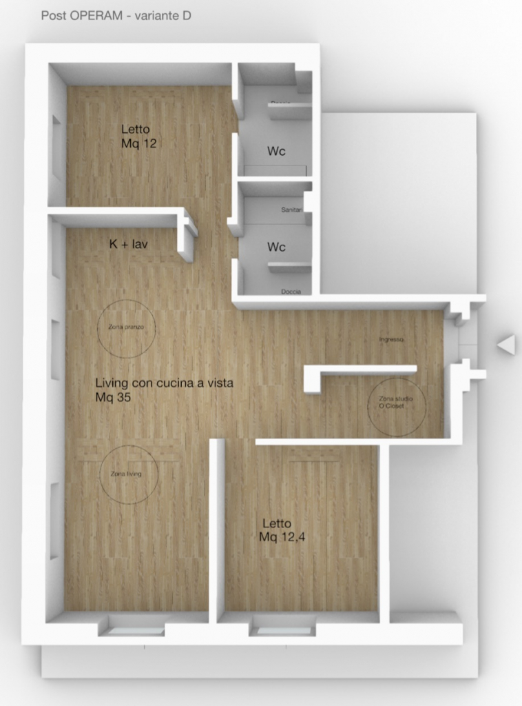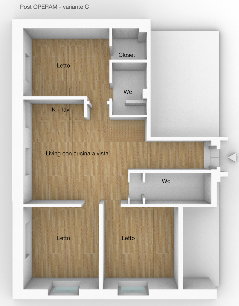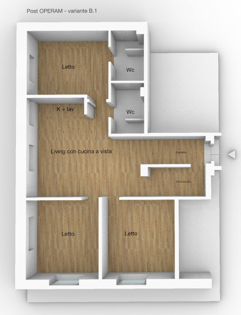 In questa variante progettuale, la distribuzione prevede un ingresso a cui segue una ampia zona soggiorno con cucina a vista eventualmente separabile creando un filtro opaco, adiacente zona living, 2 camere doppie e doppi servizi ricavati dall’originario bagno, realizzandone uno con finestra ed uno cieco; due cabina armadio closet si attestano alle due camere da letto ed una lavanderia viene realizzata di fronte al blocco servizi.