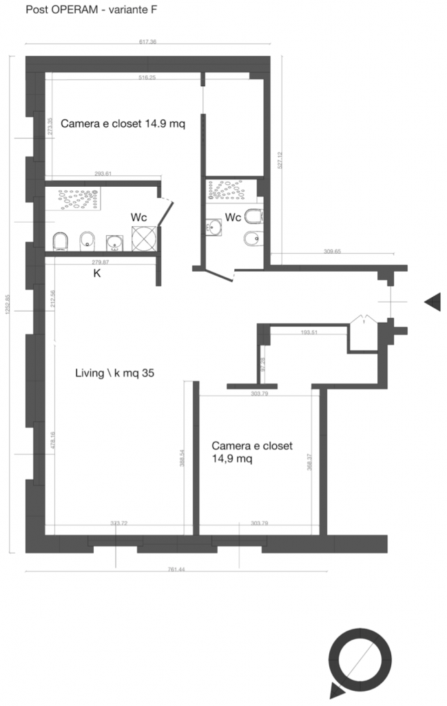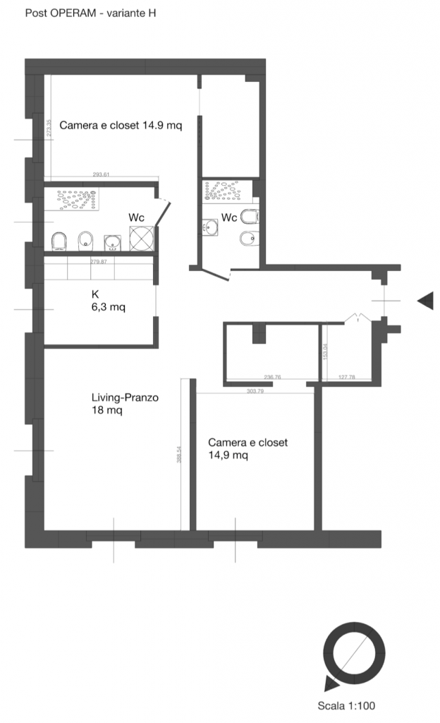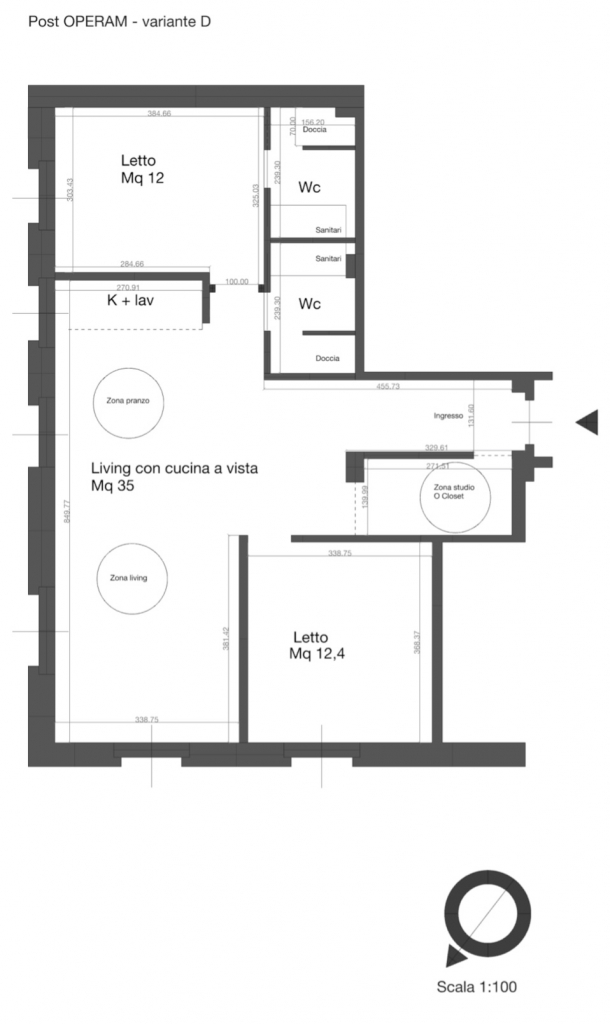 In questa variante progettuale, la distribuzione prevede un ingresso a cui segue una ampia zona pranzo con cucina a vista eventualmente filtrata attraverso una schermatura, zona living, 2 camere doppie e doppi servizi ricavati dall’originario bagno e dal rispostiglio in parte assorbito dal secondo servizio ed in parte utilizzato come closet che si attesta alla camera da letto. Anche la seconda camera da letto prevede una zona armadio-closert ricavata da parte dell’ingresso.