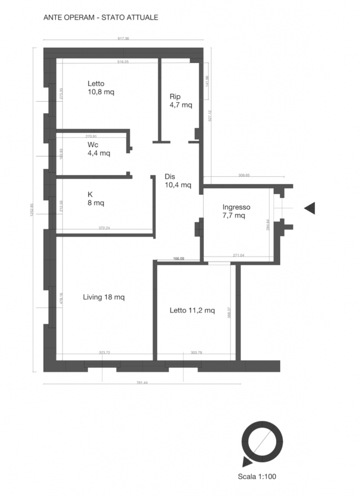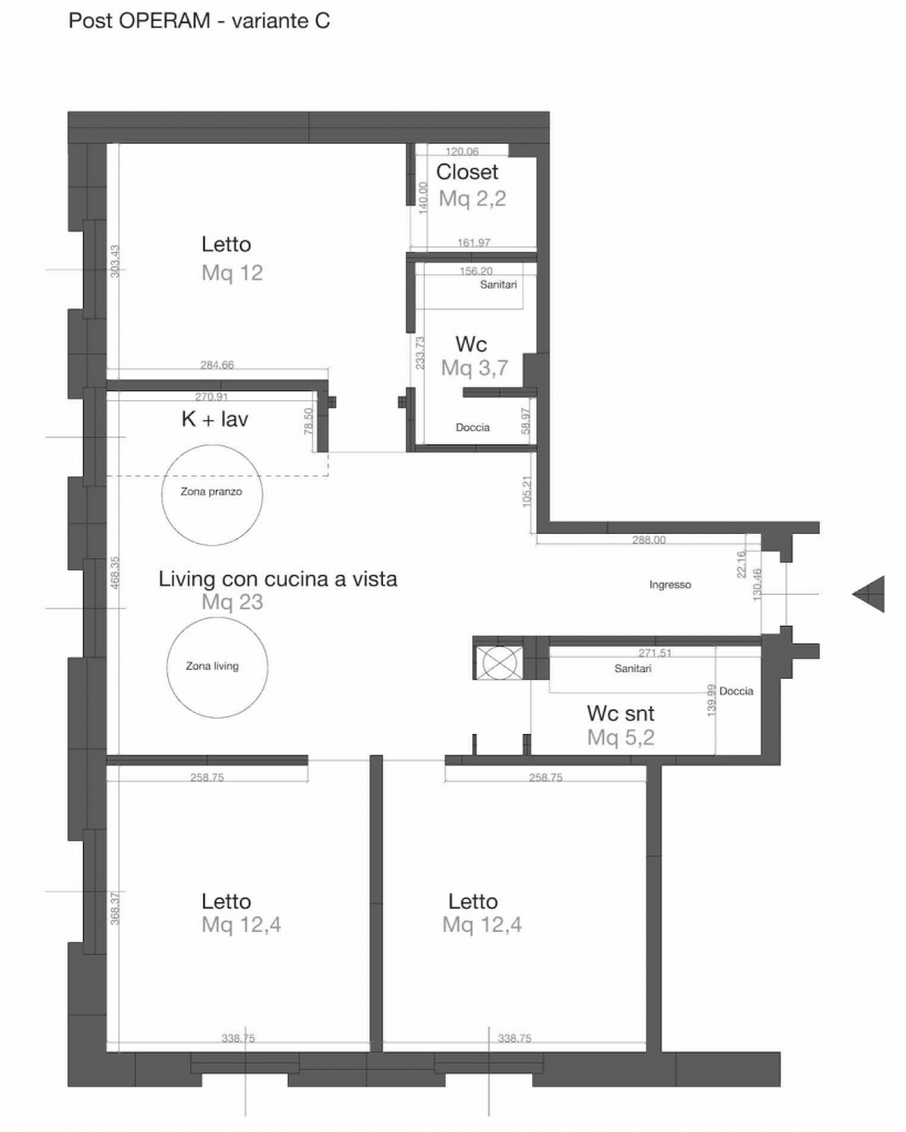 Nelle versioni presentate a seguire, si e’ ipotizzato un miglioramento degli spazi, ottenendo una nuova distribuzione degli ambienti : Ingresso soggiorno con cucina a vista, 3 camere doppie, doppi servizi e una comoda cabina armadio closet. Nelle immagini allegate, presentiamo una nuova distribuzione, partendo dallo stato attuale attraverso una serie di ipotesi progettuali tese a migliorare la vivibilità, rispondendo a criteri e requisiti dell’abitare contemporaneo.