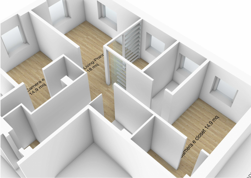 questa variante, rispetto alla F, prevede la separazione del vano cucina dal soggiorno attraverso delle pareti opache o trasparenti tale da permettere una maggiore o minore permeabilità visiva.