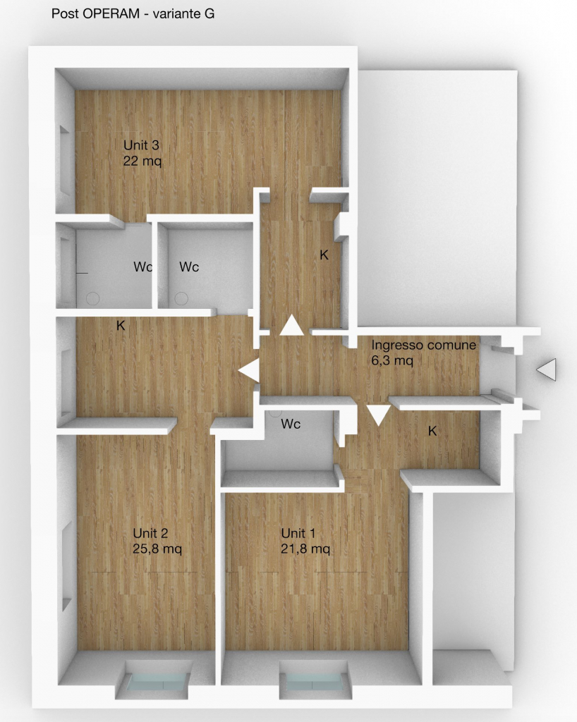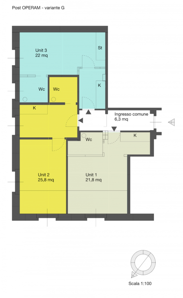 L’unità di base prevede un ampio ingresso, soggiorno, cucina, 2 camere, servizio e disimpegno. L’intervento di ridistribuzione degli ambienti viene sviluppato per ottimizzare la luminosità delle complessive 6 finestre cercando al contempo di definire una serie di opzioni adattabili a diverse esigenze di tipo residenziale o ricettivo tenendo in conto diverse tipologie di istanze.
