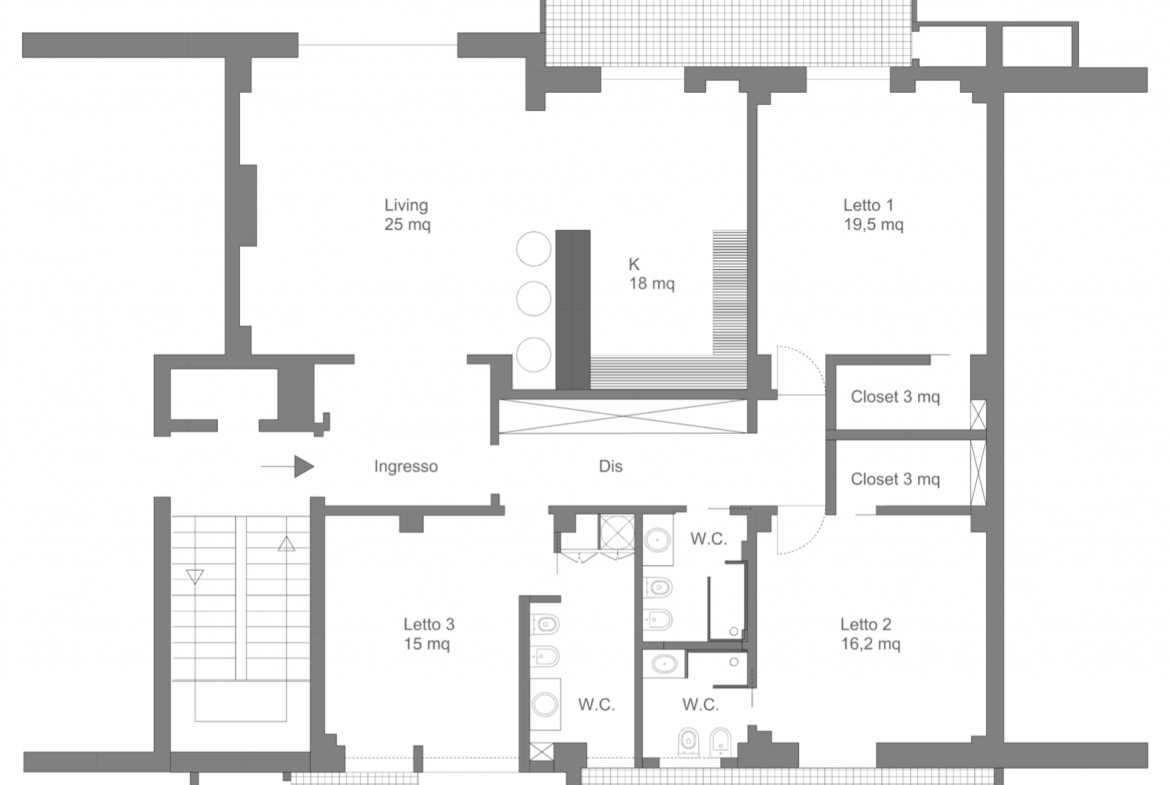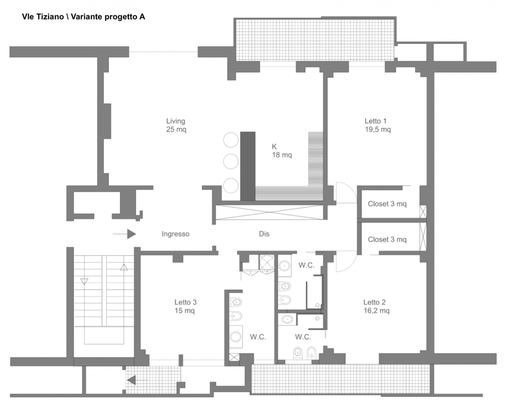 In questa variante progettuale si e’ ipotizzato spostare la zona cucina all’interno dell’area living in continuità con la’rea esterna a balcone, definiendo una netta divisione dall’area notte in cui si attestano 3 camere, 3 servizi e 2 walking closet.