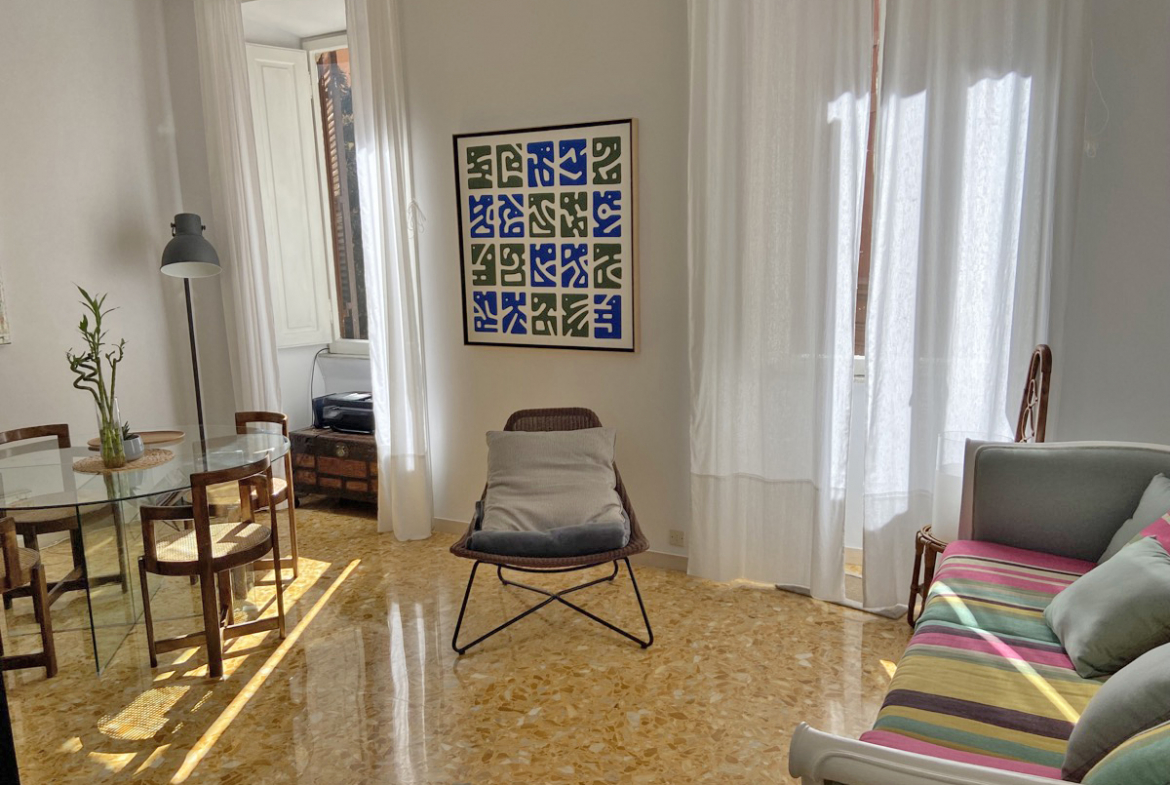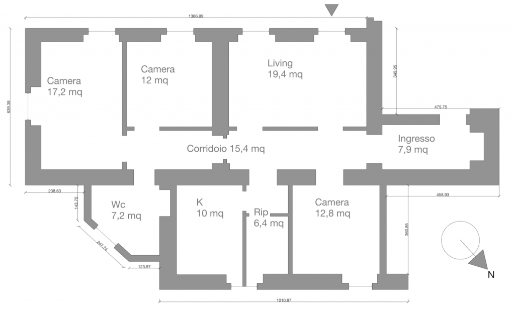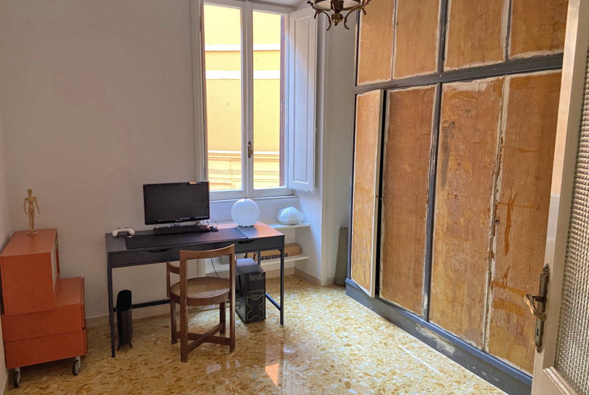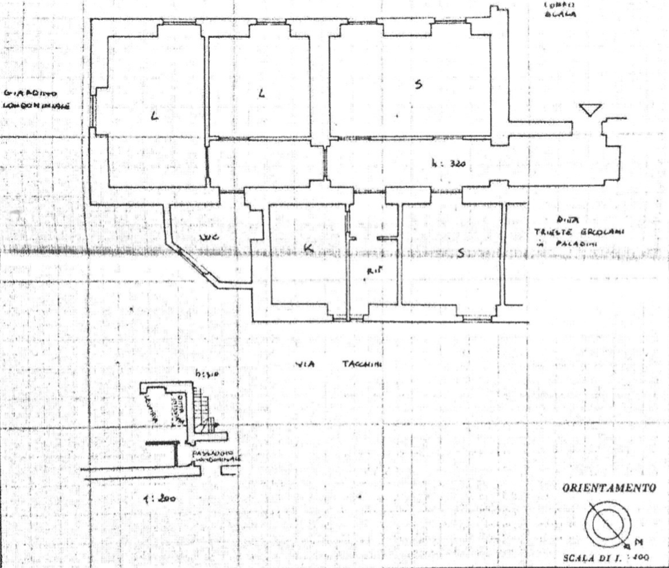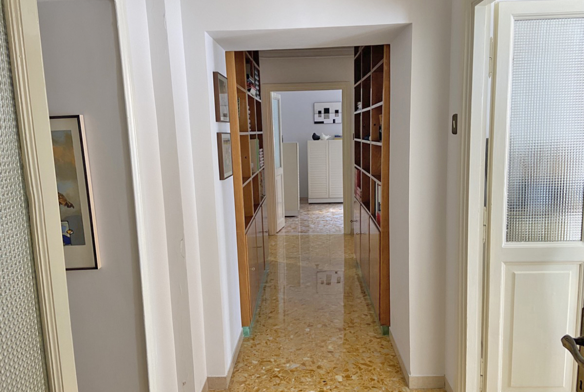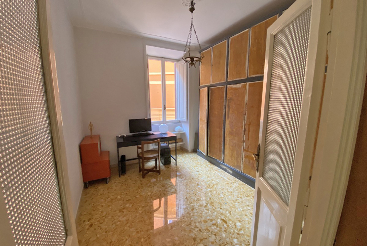 L’attuale distribuzione interna divide l’unità attraverso un ingresso ed un corridoio, soggiorno doppio con due finestre su corte interna, 3 camere, di cui due su corte ed una su strada, cucina, 1 servizio con possibilità di definire un secondo servizio nell’attuale ripostiglio.